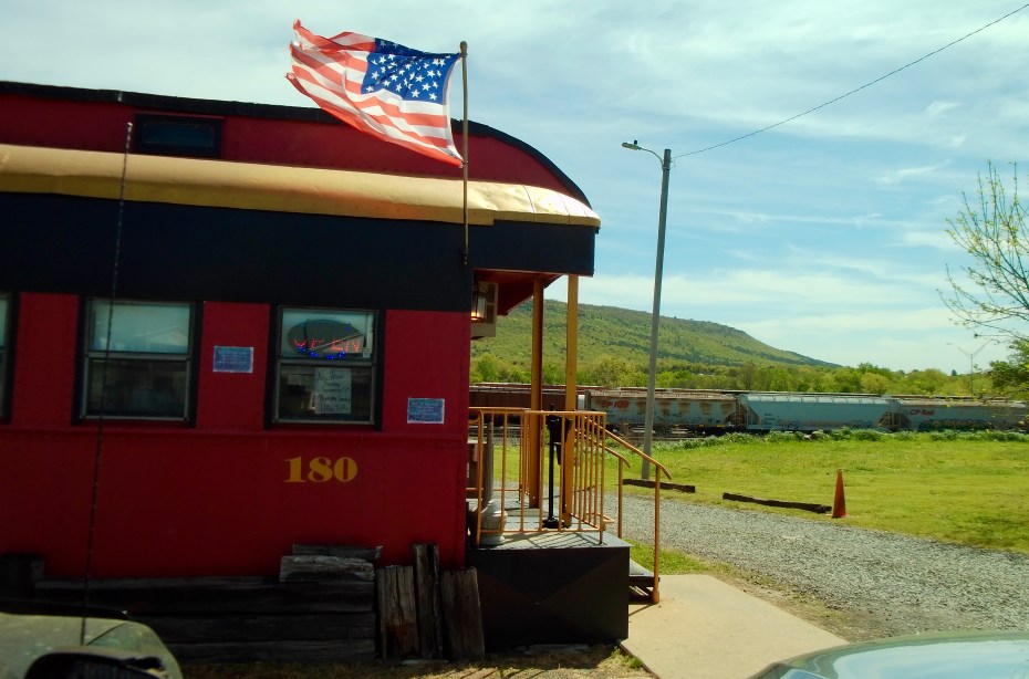 Sunday morning dawned sunny, warm and much less windy. I had the whole day free, so I drove down to the nearby town of Heavener and had a late breakfast/early lunch in an old railcar-turned-restaurant.