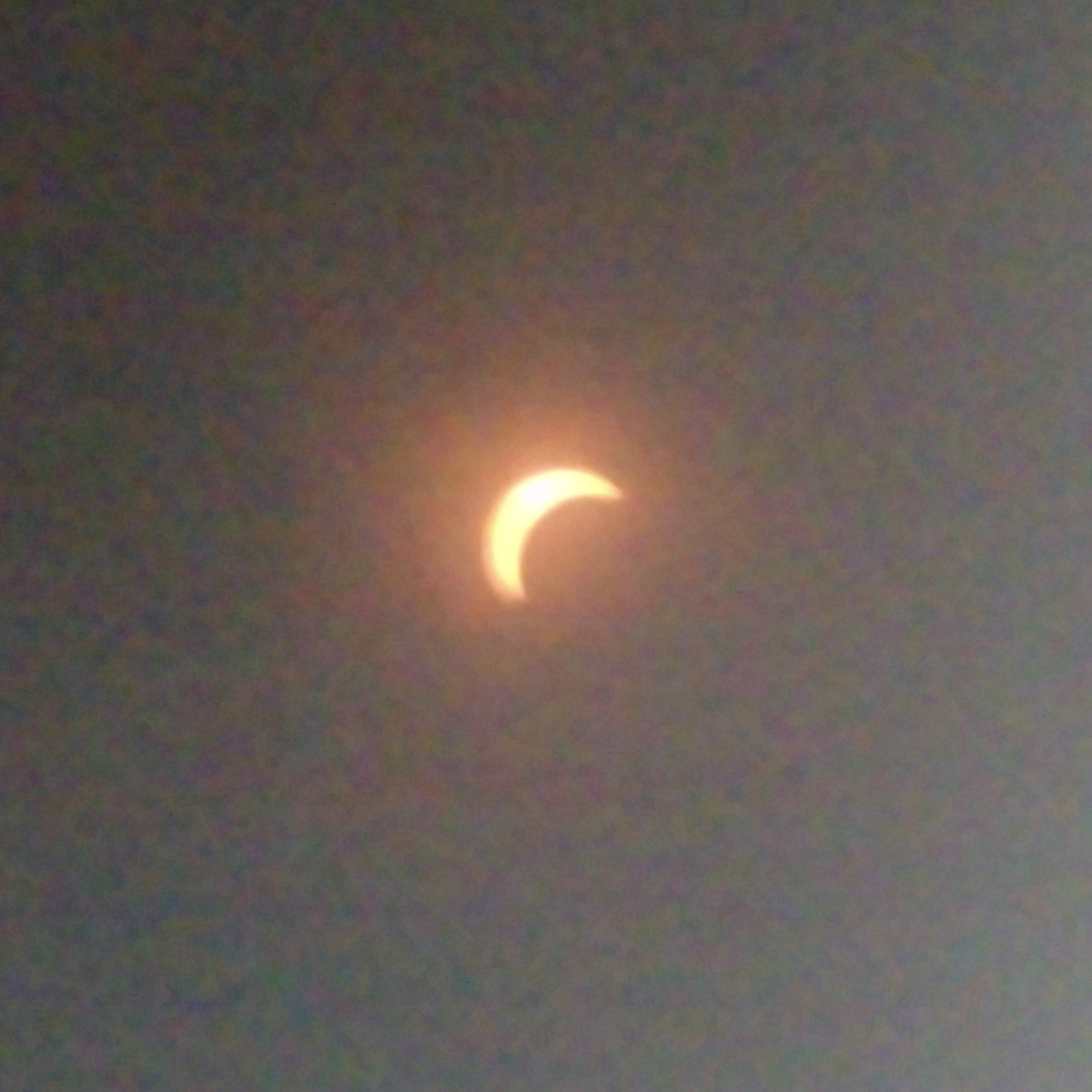 I recently bought a cheap camera with a decent zoom. I wasn’t expecting much from it in capturing the eclipse, and it lived down to my low expectations.  This is about the clearest shot I got of the crescent sun: