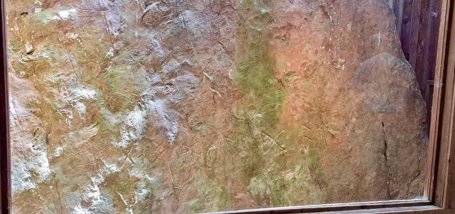 The Runestone itself has a little house built around it, with skylight windows and a glass pane protecting the stone from visitors. But some of the skylight windows are broken, and a bird had come in to sit on the stone. He was about the size and shape of a turkey vulture, but his head looked more like a seagull.
