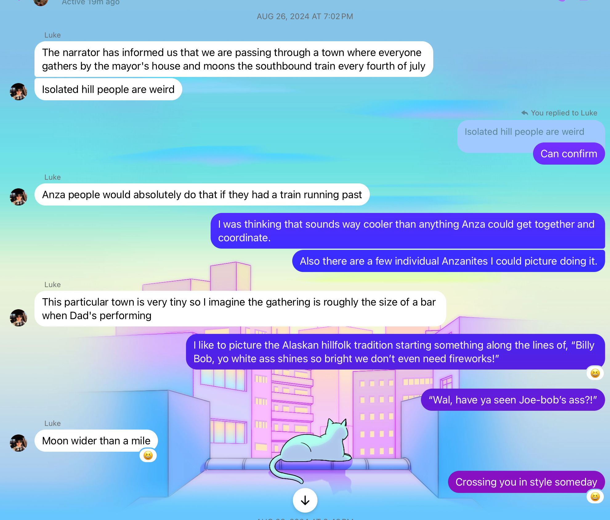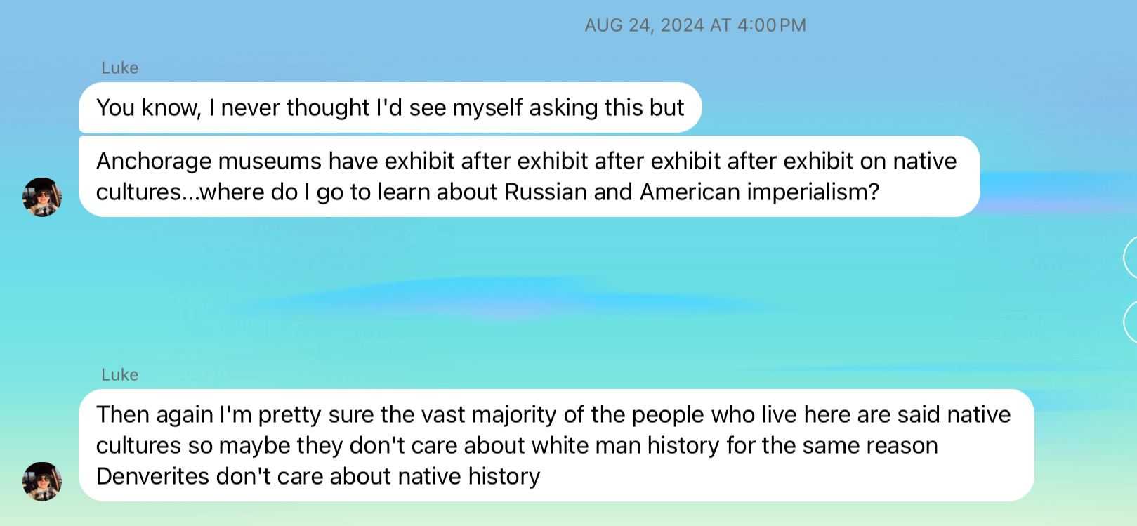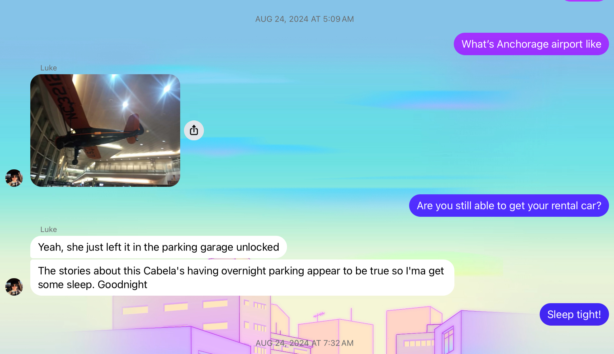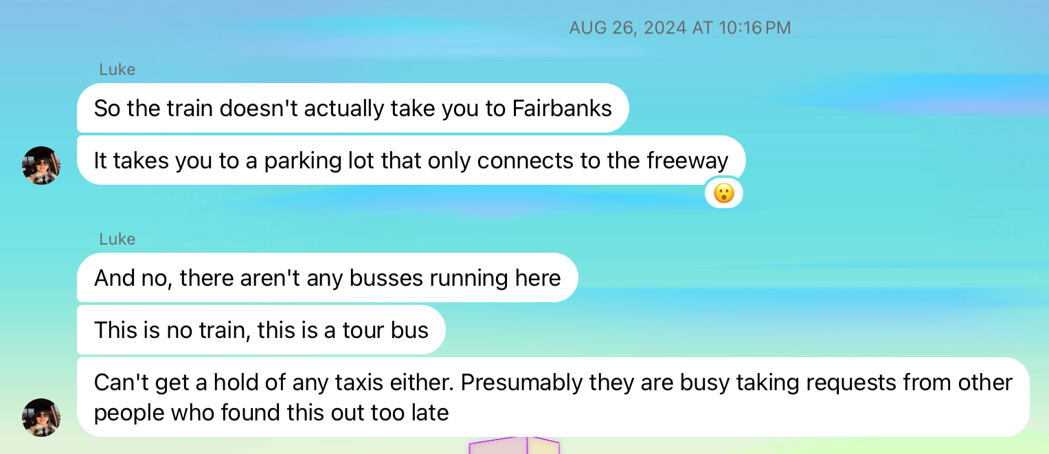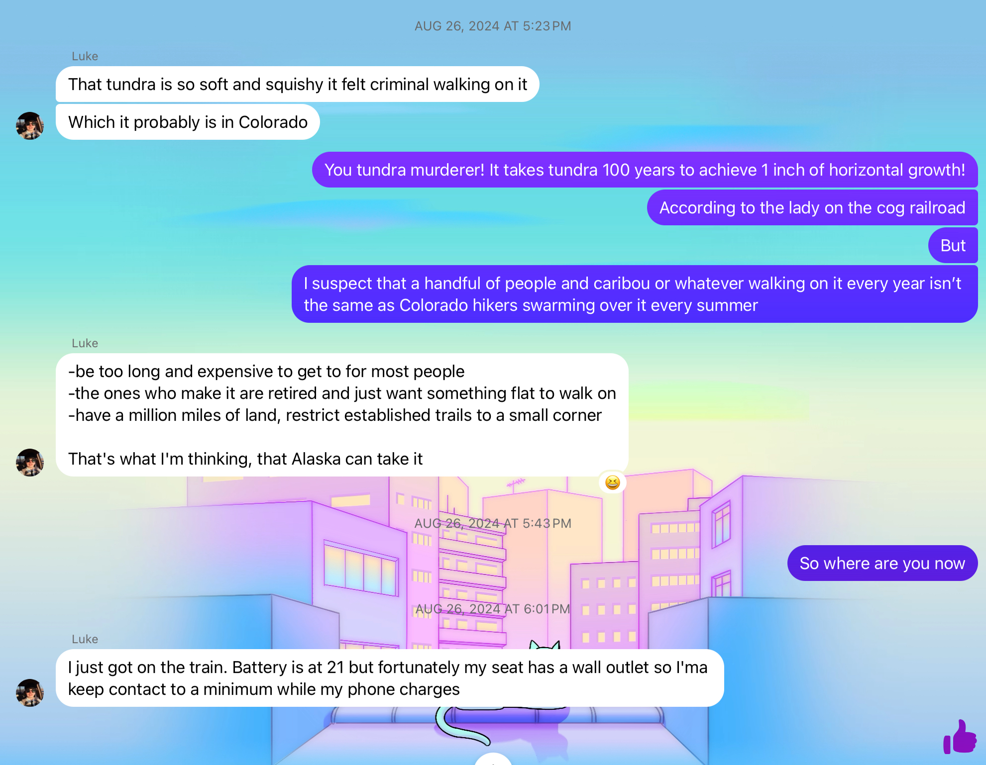 I’m skipping all the messages where he’s complaining about freezing his ass off. Apparently 45º and overcast feels a lot colder in damp Alaska than in dry Colorado.
