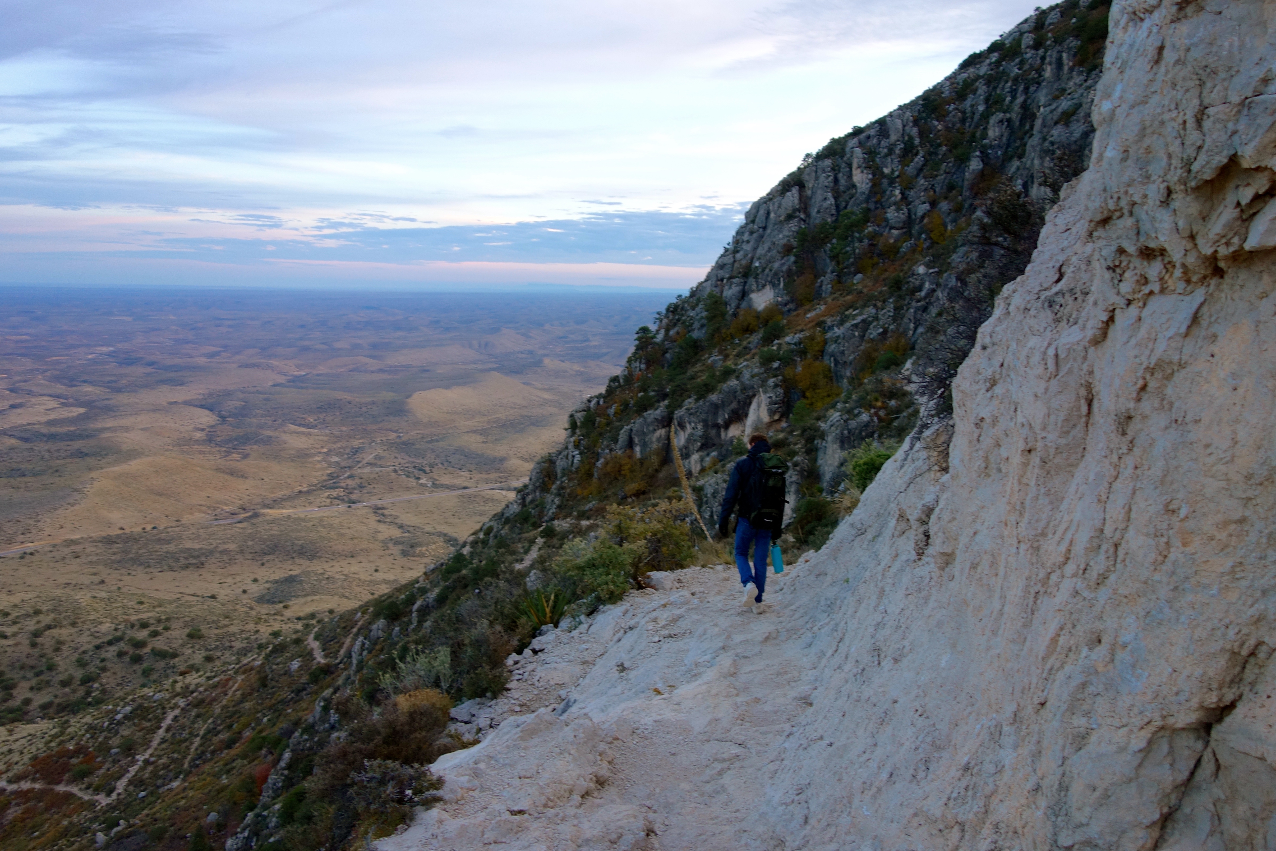 Of course, just as we got back to the park entrance, they were closing the gate. All parking lots full. Closest place to park was the Pinery Trailhead turnout off the highway. It meant walking a mile just to get from the car to the Guadalupe Peak trailhead, but you know, no problem. Be the rubber ball.