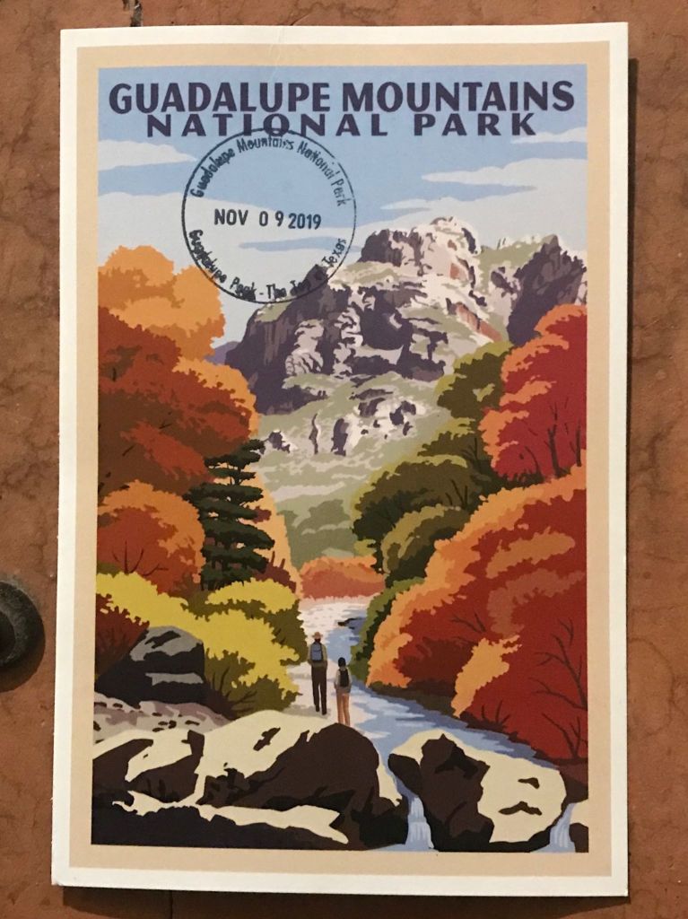Quick tangent! I just recently learned about the National Park “passport” stamps. If I had known about them sooner, we could have started our collection at Carlsbad Caverns and the Grand Canyon. There are six Guadalupe Mountains stamps to choose from, one for each of the park’s most popular destinations. I bought a pretty postcard at the Visitor Center, found the Guadalupe Peak stamp and officially started our collection.