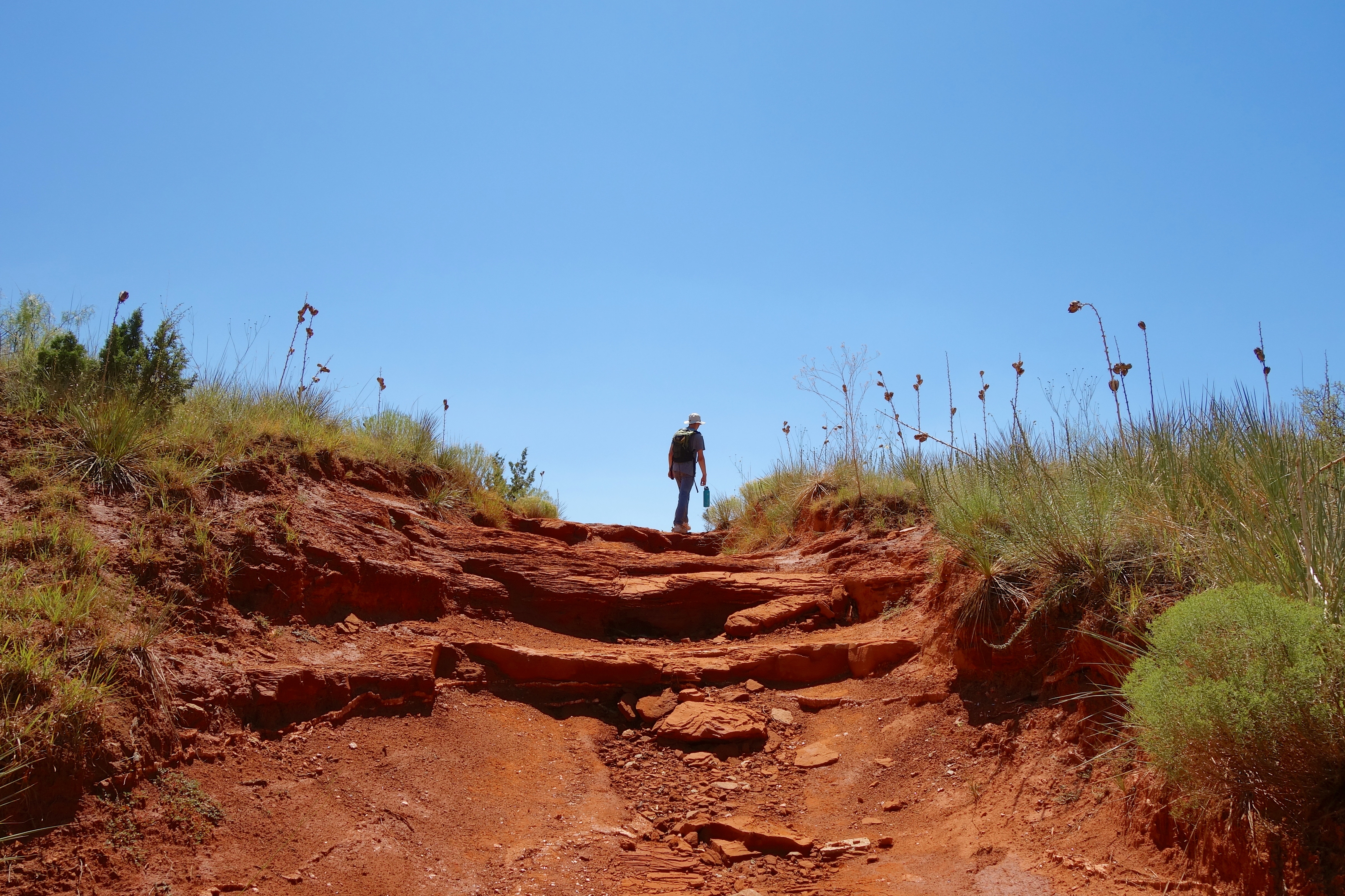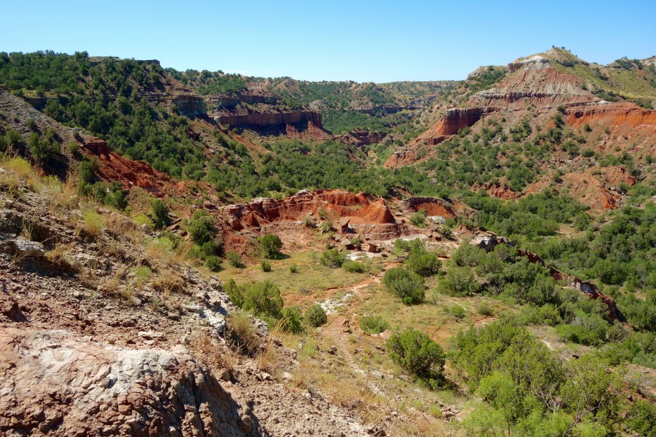 But Rock Garden Trail’s best scenery is on the way up. The vista from the top is, in our opinion, rather underwhelming. It does connect with a rim trail at the top that probably leads to better views, but by then we were running low on water and had to head back down. We still hadn’t gotten a really good look at the canyon, and we were starting to wonder if Palo Duro were overhyped.