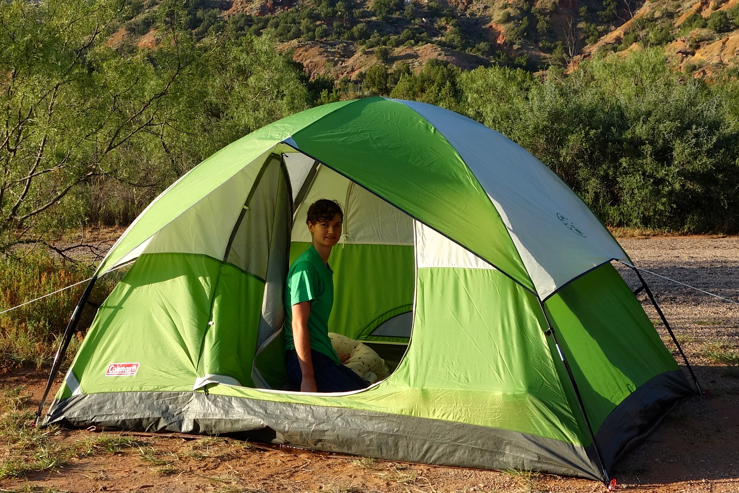 Luke and I have slipped the surly bonds of customer service and gotten regular weekday jobs, which has improved the quality of our lives by about a billion percent. Elizabeth is still working in the food industry, but she likes her current job well enough and she was able to request the Labor Day weekend off without too much trouble. When the big weekend arrived, we napped through the worst of the Friday afternoon and evening commuter traffic, and then rolled out of Austin at 12:30 a.m. Seven hours later the sun rose on a flat world of corn, cotton, cattle and graceful white wind turbines. Around 8:00 a.m. we arrived at Palo Duro Canyon State Park.